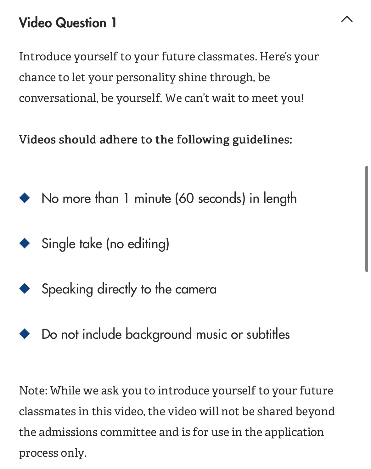 인터뷰 인비테이션을 받으니 시카고에서 비디오 에세이를 요구했다.. 가슴이 철렁했지만 정말 정말 정말 다행히도 앞서 말했던 1번 유형이었다. 정말 진짜 하늘이 살렸다고 해도 과언이 아니었다. 정말 3번 유형이 나온다면 너무 자신이 없었기 때문이다. 심지어 정말 천사같이 기간도 넉넉히 주었다. 덕분에 그래도 준비도 잘하고 연습도 많이 한 후에 제출할 수 있었다.