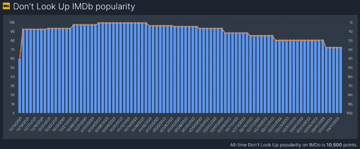 혜성 충돌이라는 쉬운 소재에 정치라는 어려운 이야기를 입혔음에도 넷플릭스에서 가장 높은 시청시간을 기록할 수 있었던 것은 날카로운 현실 직시와 그 속에 등장하는 적절한 ‘풍자’의 적정한 거리감 덕분이다. 그렇다고 감독이 영화를 통해 전달하고자 했던 메시지를 다 전달하지 못했던 것은 아니었다. ‘탈 진실’ 현상이 더욱 뻔뻔해지고 있으며, 매스컴과 권력자에 의해 객관적인 진실을 믿던 주인공이 타락해가는 모습을 통해 확실하게 보여준다. 이것을 외면하게 되면 끝내 우리가 맞게 될 미래 모습은 영화의 결말과 같이 종말 일지 모른다고 확실히 전달하고 있다. 그렇지만 이 메시지는 감독이 처음에 전달하고자 했던 ‘기후위기’ 뿐만이 아닌 현재 우리 주변에 발생하고 있는 정치적인 문제들에도 적용된다. 그러므로 우리 주변의 문제를 인식하게 만든다는 점에서 이 영화는 좋은 영화이자, 성공한 영화라고 할 수 있다. 다만, 이 메시지를 전달하는 방식이 너무나 직설적이고, 관객이 받아들이는 것에 여지가 적다는 점에서 관객의 취향이 나뉘는 결과가 생겼다는 결론을 내릴 수 있겠다.