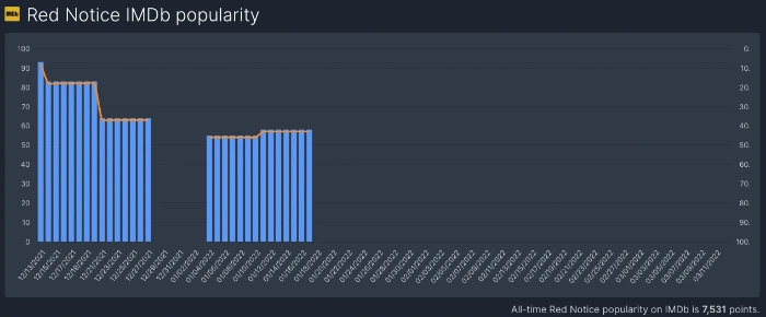 여기서 다소 재미난 점을 발견할 수 있다. 그림 2. 에 비슷한 시기에 공개된 <레드 노티스>라는 작품이 <돈룩업>을 제치고 1 위에 랭크되어 있는 것을 확인할 수 있다. 여기서 간단한 소개를 하자면 <레드 노티스>라는 작품은 더락과 라이언 레이놀즈, 갤 가돗이 출연하고, 넷플릭스 역대 최대 제작비 2000 억 원을 투자해 만든 영화라고 한다. (돈 룩업은 1000 억 원 제작비)