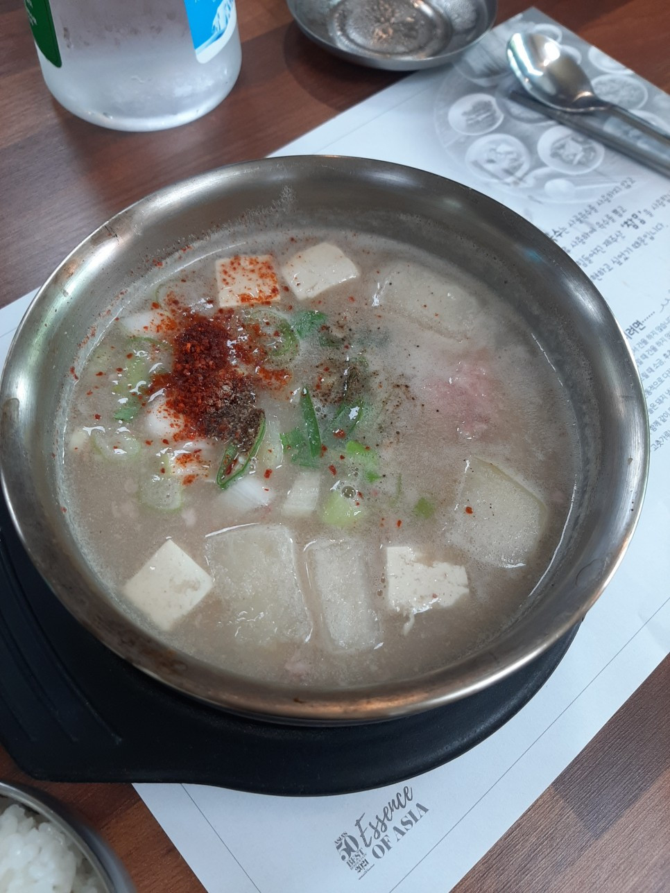 접짝뼈국은 제주 토속음식으로 돼지 목뼈를 지칭하는 접짝 뼈의 부위를 말하고 무와 함께 끓여 고아낸 제주식 해장국을 말한다. 감자탕과 비슷하지만 더 담백하고 맛있다고 해서 굉장히 기대한 음식이다. 내가 인터넷에서 미리 찾아본 접짝뼈국은 고기가 두툼하게 붙은 뼈가 고깃국에 빠진 모양으로 생겼는데, 내가 주문한 곳에서는 고기가 모두 분해된 모습으로 고기보다 무와 두부도 함께 들어가 있었다.