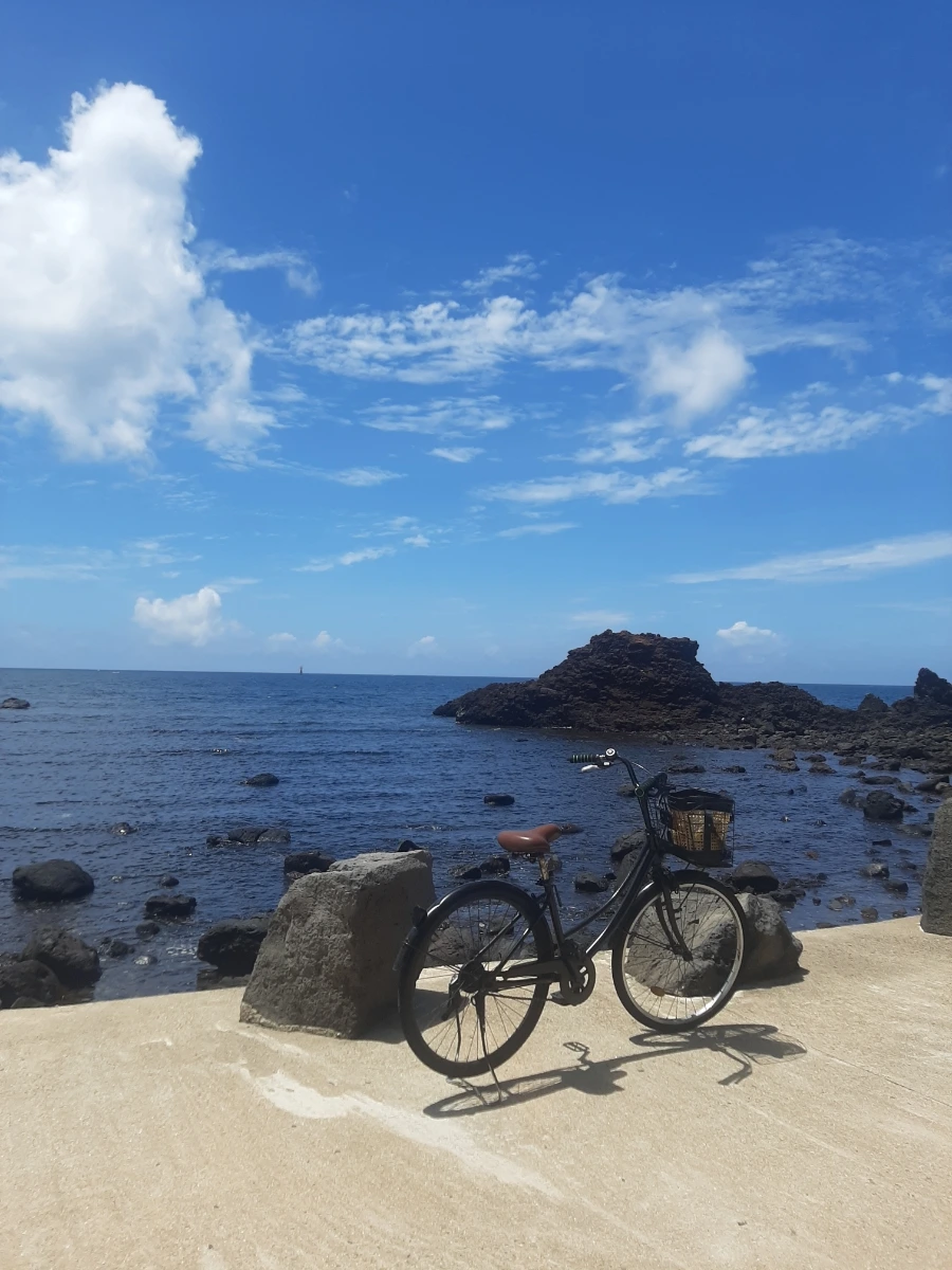 비양봉에 올랐다 내려가는 길은 더욱 수월했다. 비양봉에서 내려와 이제는 해안도로를 산책해보기로 했다. 그런데 우리가 비양도에 간 날이 햇빛이 유독 강하고 정말 더운 날이라 걷는 것이 쉽지가 않았다. 마침 자전거를 빌리는 곳이 있다고 해서 찾아갔다. 하루 5천 원이면 무제한 이용이 가능하다. 그런데 자전거 관리가 제대로 되고 있지 않아 제대로 된 자전거를 선택하는 것이 어려웠다. 우여곡절 끝에 자전거를 빌려서 해안도로를 달렸다. 자전거를 타고 바라보는 바다의 모습은 더욱 아름다웠다. 시원한 바람이 내 얼굴을 스칠 때마다 행복했다.