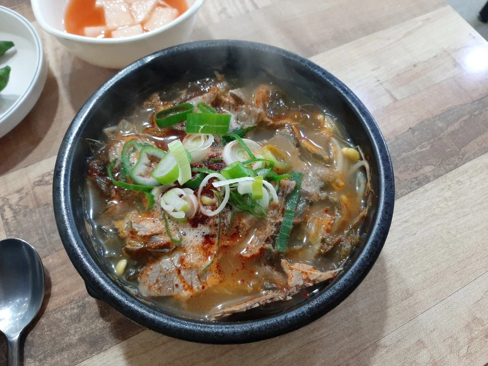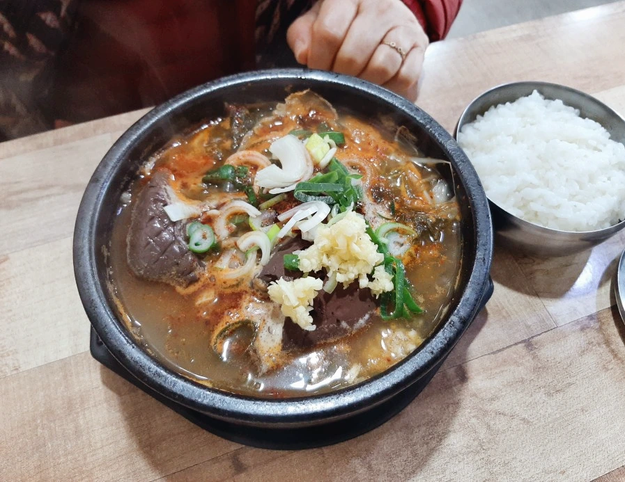 이곳은 세 가지 메뉴가 판다. 소고기 해장국, 선지해장국 그리고 내장탕이다. 나는 소고기 해장국을 엄마는 선지해장국을 주문했다. 소고기 해장국엔 배추와 콩나물 그리고 소고기가 들어가 있다. 국물의 맛이 짜거나 매운 그런 자극적인 맛이 아니라 깔끔한 맛이라 좋았다. 그 후에 엄마의 선지해장국 맛이 궁금해서 덜어먹어 보았다. 선지를 하나 먹고 나니 나도 선지해장국을 주문할걸 하는 아쉬움이 남았다. 내가 시킨 해장국보다 늘 남이 시킨 해장국이 맛있는 것을 보면 내가 문제인 것 같다.