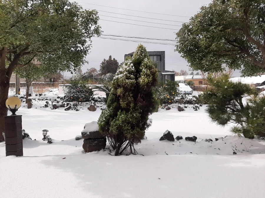 제주의 주택 집에 살게 되며 눈이 오는 것은 풍경이 너무 예뻐 황홀한 기분이 든다. 그러나 밖으로 나갈 생각에 불안해지기도 한다. 이번 크리스마스 연휴처럼 밖으로 나가도 되지 않는 날에는 이렇게 펑펑 내리는 눈을 바라보는 것도 기분 좋고 특히 정원 가득 소복하게 쌓인 눈은 정말 아름답다. 특히 눈이 많이 왔다고 집 앞에서 신나게 뛰어노는 아이들을 보니 괜스레 마음이 촉촉해진다.