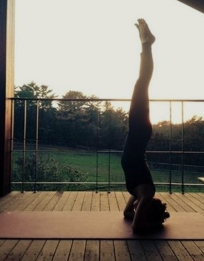 4. 한쪽 발을 올리고 몸의 중심을 잡은 후 다른 쪽 발을 들어 올려 두 발로 위로 쭉 뻗는다. 완성된 자세에서 1~2분 정도 복식호흡을 하며 몸의 변화를 느낀다.