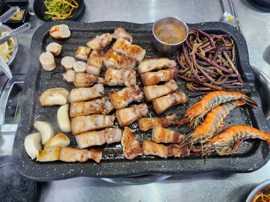 그런데 내가 아는 고깃집이 있어야 데려가지... 실은 나도 자주 못 먹는 흑돼지를 어디로 먹으러 가자고 해야 할까 싶었다. 어디에서 보면 제주도민 찐맛집 이런 곳이많다던데 나는 아직 그런 곳을 찾아내지 못했기 때문이다. 나도 손님이 오시면 먹고 싶은 메뉴를검색하고,주로 여행자들이 가는 맛집을 찾아다니고 있는 처지라 추천할 곳이 없었다. 결국은 또 검색해서 후기가 좋은 곳으로 다녀왔다. 철판에 구워 먹는 흑돼지. 역시 훌륭했다. 심지어 도민 할인도 되는 곳이라 더욱 마음에 들었었다.