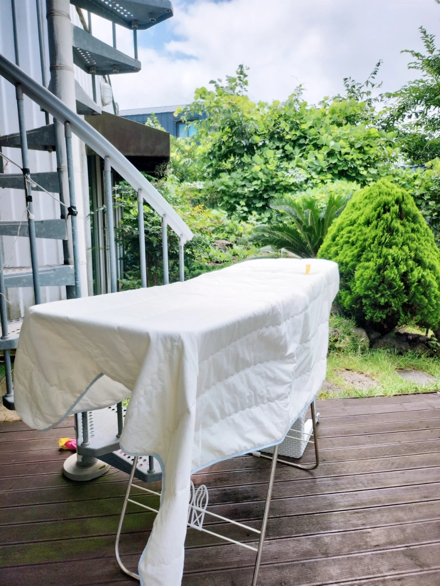 바로 얼마 전까지도 제주 집은 추워서 사계절용 이불을 덮고 잤다. 원래는 사계절용 이불을 정말로 사계절 내내 덮고 자야지 하고 생각했다. 봄, 가을에는 하나씩 덮으면 되고 겨울에는 집이 추워서 사계절 이불을 두 개 정도 덮고 자면 딱 맞았다. 그런데 문제는 여름에 덮기엔 두꺼웠다. 여름이 된 이후에도 계속 사용하고 있긴 한데 막상 덮고 자기엔 무겁고 두껍고, 그러자고 치워버리기엔 아쉬웠다.