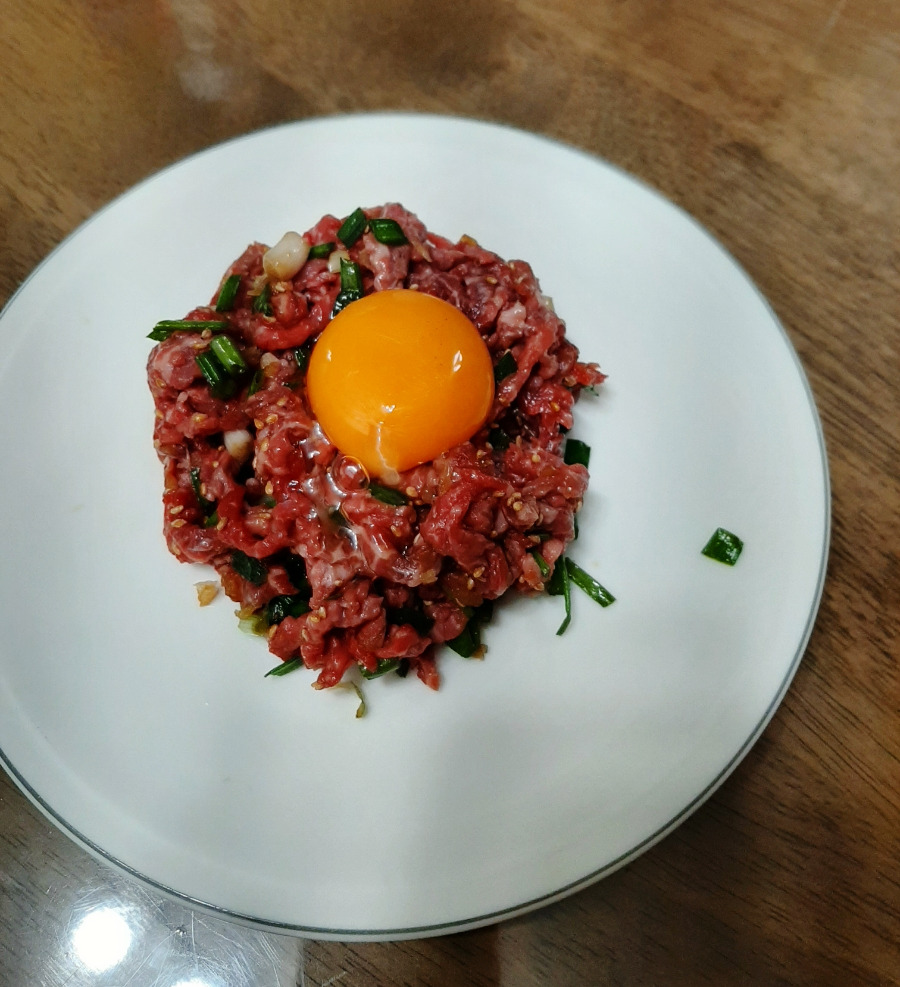 그렇게 완성된 육회! 내 인생 첫 육회 만들기! 최소한의 양념 맛으로도 훌륭했다! 아쉽게도 우리 집엔 배가 없었지만 그 나머지 재료만으로도 충분히 맛있었다. 역시 메인 재료가 신선해야 하는구나 생각했다. 집에서 육회를 먹다니 남편이 더 놀랐다! 하하하. 오늘 요리도 성공적이다.