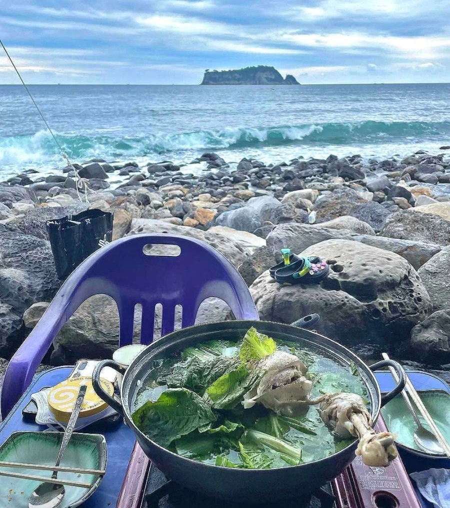 콸콸 흘러나오는 얼음 계곡에 발을 담그고 먹는 백숙, 정말 최고다!! 특히 더운 여름날,발이 얼어버릴 정도로 시원하다. 게다가 바다 풍경과 범섬뷰에 눈이 황홀할 지경이다. 눈도 즐겁고 입도 즐거우니 이곳이 바로 지상낙원이 아닐까?