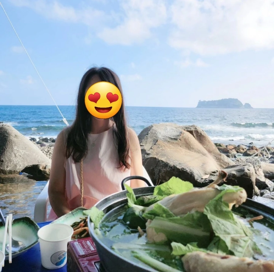 나도 여름에 계곡에 놀러 갈 때면 이렇게 백숙을 먹고는 했는데(혹은 닭볶음탕) 그때는 계곡을 옆에 두고 있는 평상에서 먹는 곳이었다. 그런데 이곳은 직접 계곡에 들어가 발을 담그고 먹는 곳이라 더 이색적이다. 그것뿐만 아니라 바로 앞이 무려 바다뷰이다. 속골은 제주 최고의 바다뷰 맛집이 아닐까 싶다.