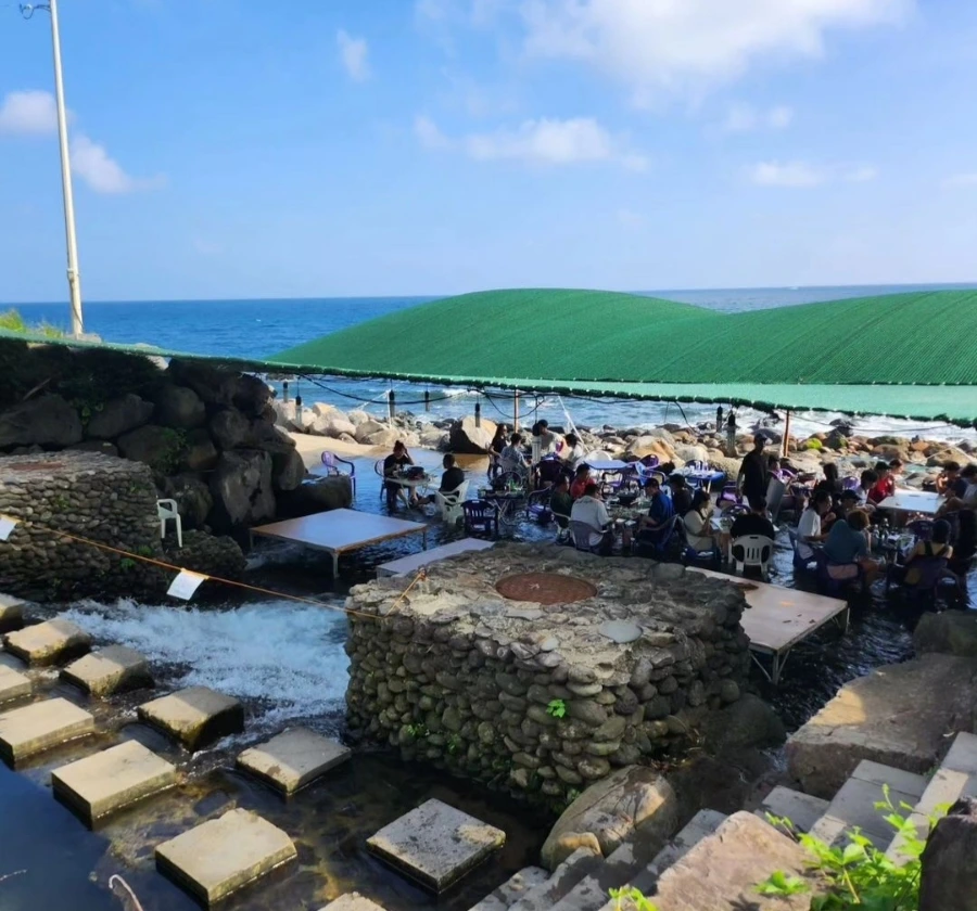 그러니까 계곡과 바다가 만나는 지점을 돌로 막아놓고, 초록 그늘을 씌우고, 의자를 놓으면 완성되는 여름한정 음식점이다. 한쪽에서는 계곡으로 시원하게 물이 흐르고 있다. 아이들과 온 손님들은 음식점 대기할 때 저곳에서 물놀이를 한다고 했다. 아이들과 물놀이하고 먹는 음식은 생각만 해도 군침이 돈다.
