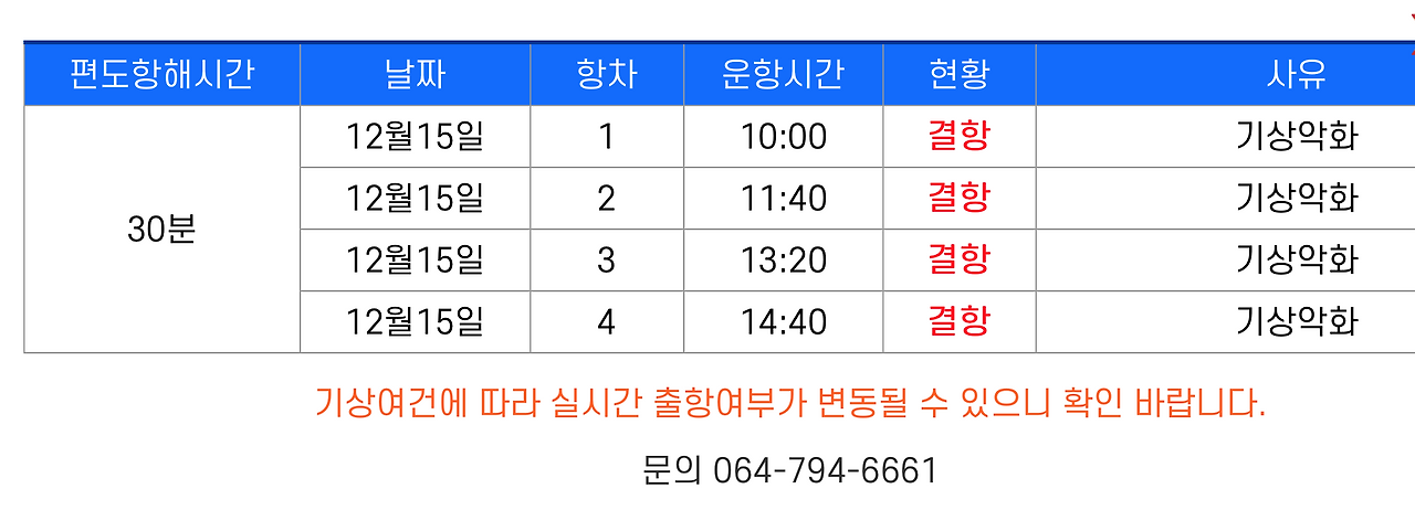 오늘도 비가 온다. 이번주 내내 비가 왔고 오늘은 바람도 많이 부는 것이 오늘은 누가 봐도 분명 마라도에는 가지 못하는 날일 것이다. 혹시나 해서 글을 쓰다가 홈페이지에 들어갔더니 너무 당연하게도 결항이다.