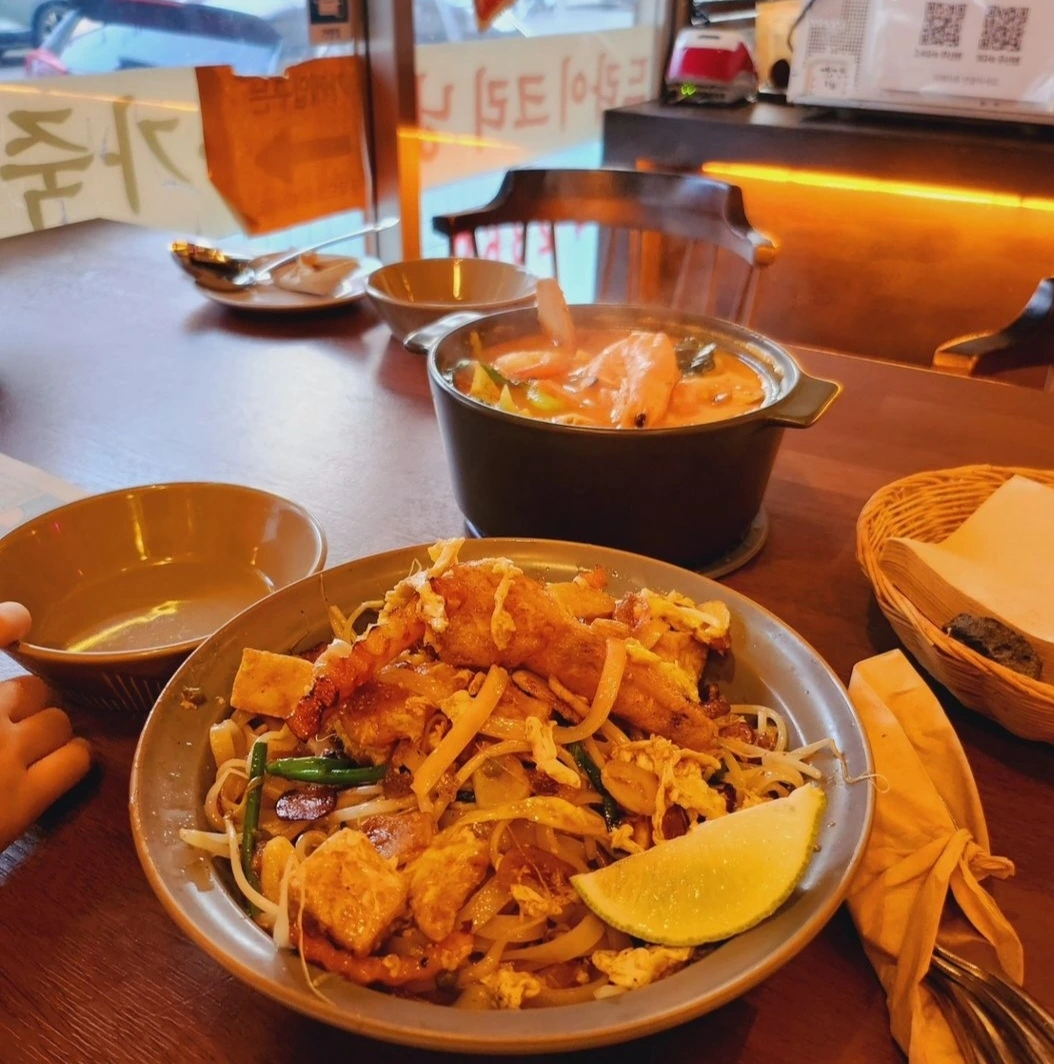 그곳엔 기다랗고 커다란 테이블이 한 개가 놓여있었다. 다행히도 첫 손님이어서 자리는 넉넉했다. 메인 메뉴가 7개 정도 되었는데 그중에 팟타이와 똠얌꿍 그리고 팟 카파오 무쌉을 주문했다. 팟타이는 역시나 맛있었다. 특히 안에 씹히는 마른 새우가 매력적이었다. 똠얌꿍은 실로 오랜만에 먹어봤는데 맵고, 시고, 달고 다양한 맛이 존재했다. 정말 매콤해서 맛있었는데 비 오는 날이나 겨울에 한 번 더 먹어보고 싶다는 생각이 들었다. 오랜만에 먹는 태국음식이라 정말 마음에 들었다.