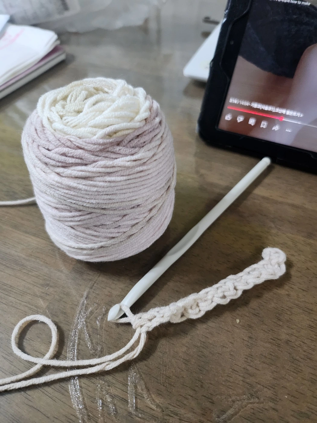 그리고 며칠 후 실을 찾으러 갔다. 그리고 다른 실을 더 구매해 왔다. 그런데 이제 막 시작하는 초보 뜨개인이 목도리를 뜨는 것은 엄청난 어려움이었다. 그래서 컵받침을 떠보기로 노선을 바꿨다. 그런데 분명 시작은 했는데 그다음 넣을 코가 잘 보이지 않는다. 분명 코가 잘 보이는 실인데 왜 내 눈에만 여기가 맞나 싶은 건지 모르겠다. 휴... 한번 떠보고 두 번 떠보고 일단 시작은 했는데 이게 맞는지 모르겠어서 다시 내려놓았다.