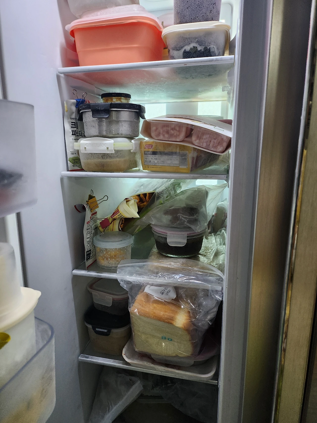 최근에 공구로(처음 사보았다) 산 돈가스와 떡갈비가 보관되어 있다. 게다가 빵도 사면 한 번에 다 먹지 못해 남은 것은 얼려놓고 먹기 때문에 그것도부피를 많이 차지한다. 그래서 냉동실은 냉동실에 비해 내용물이 가득 차 있는 편이다.