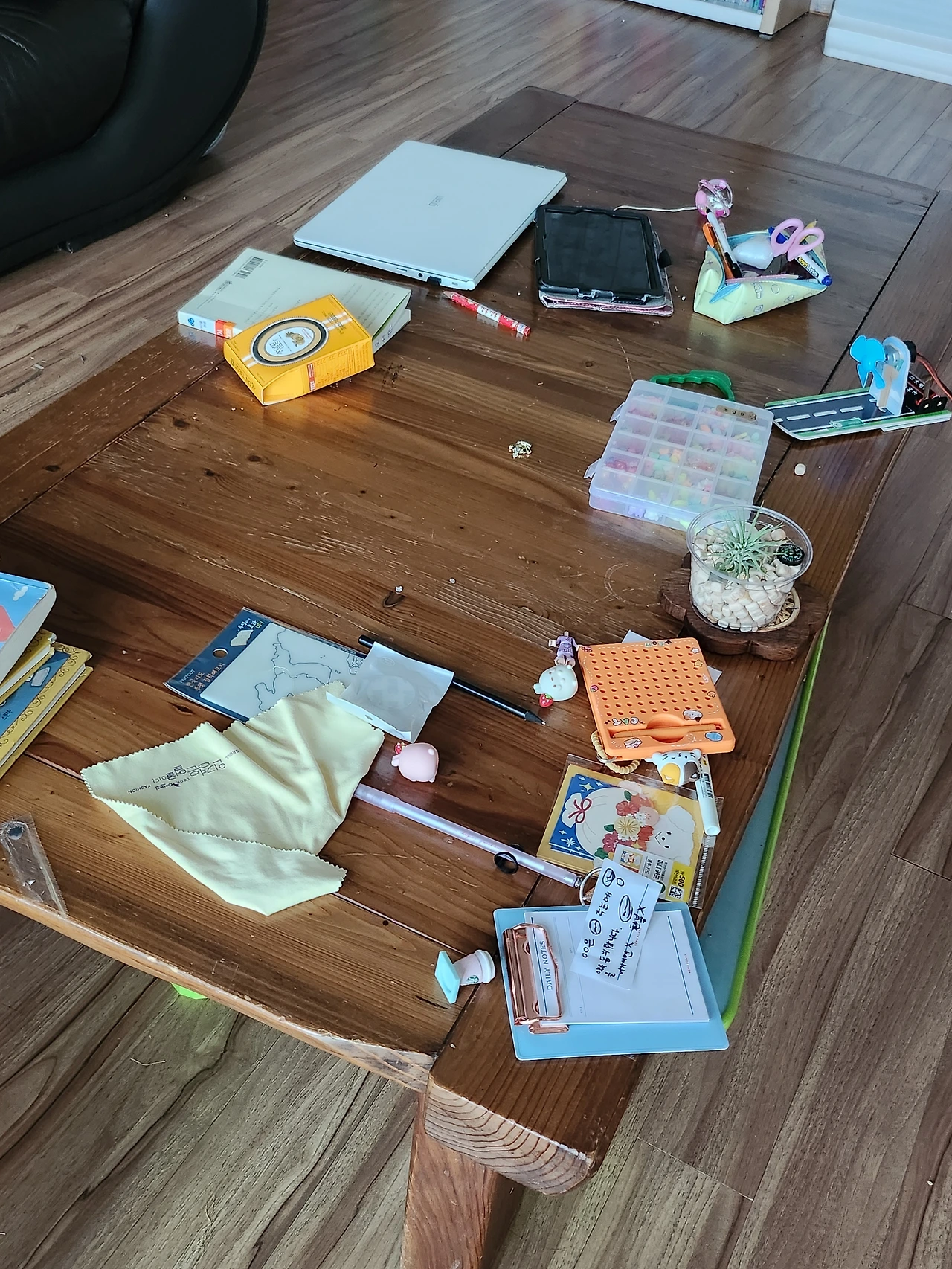 그날 오후 집에 돌아와 거실을 살펴보는데 의자에도 물건이 가득, 심지어 의자에 옷도 걸려있었다. 그리고 소파 중에 가장 넓은 부분에도 컴퓨터, 독서대 등등이 올려져 있어서 참 지저분했다. 뭐... 소파 앞에 있은 테이블은 이미 장난감과 책 등등 가득 올려져 난리가 난 상태였다.