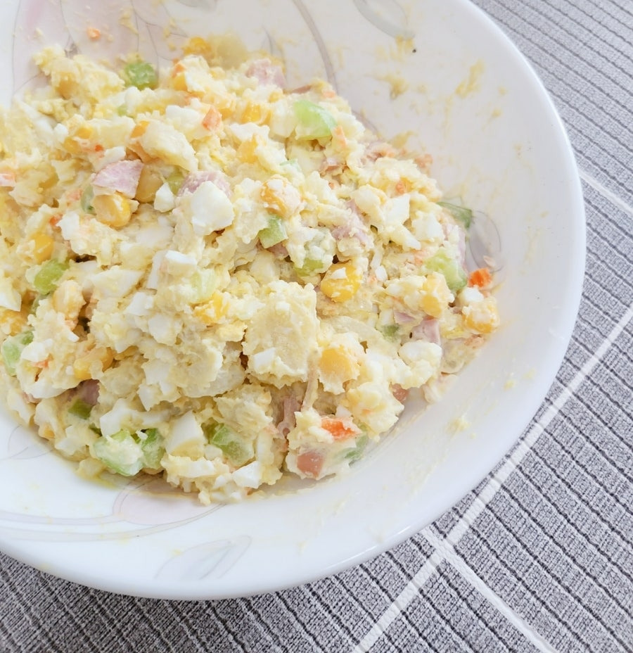 그리고 하나의 그릇에 감자, 계란, 오이, 옥수수, 소시지를 모두에 넣는다. 여기에 들어가는 소스는 아주 간단하다.