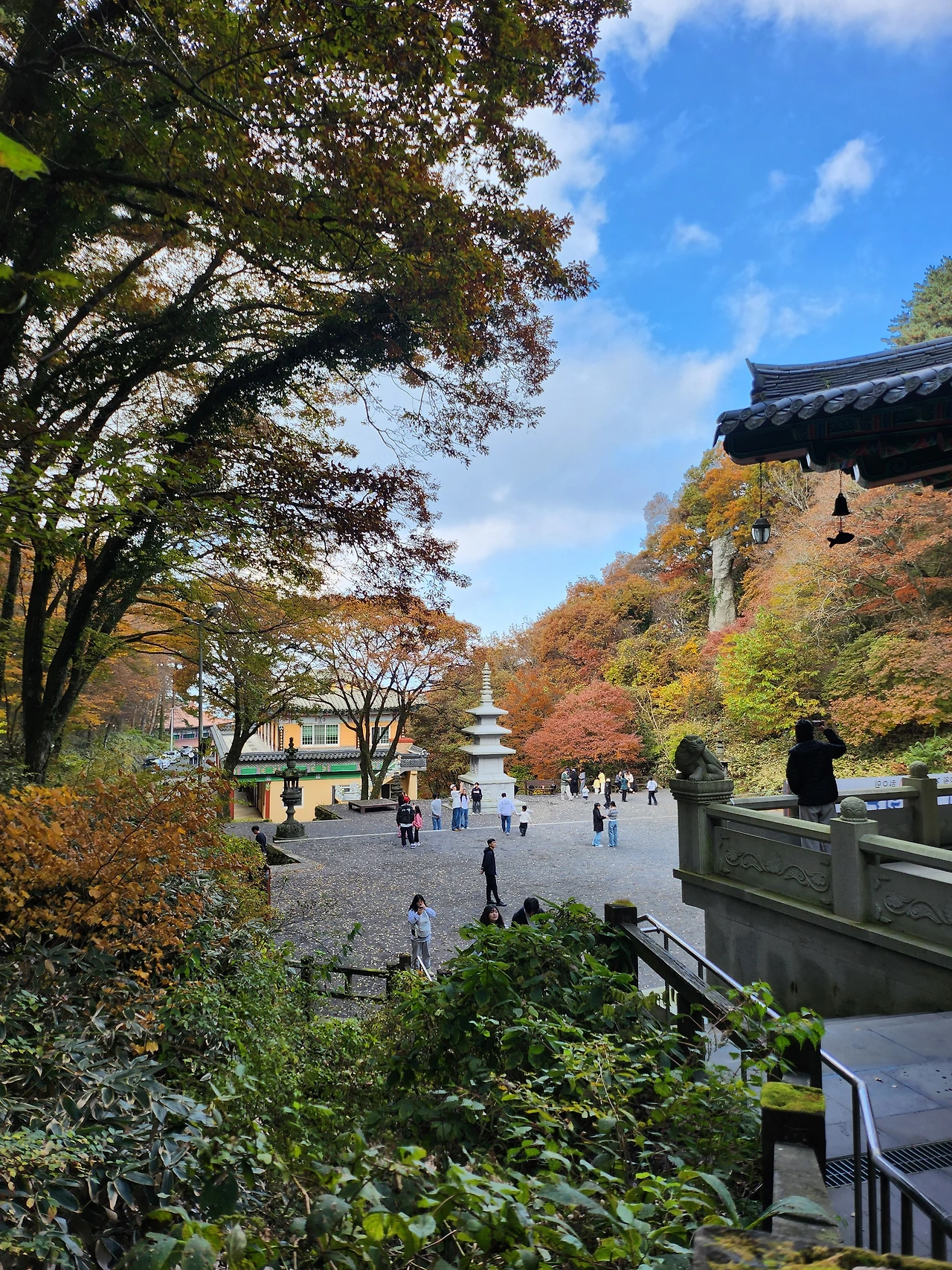 사람들은 단풍을 구경하러 온 사람들로 많았다. 단풍은 이제 시작이 아니라. 끝자락인 듯 낙엽이 많이 져 있었다. 게다가 제주의 단풍은 처음이었은데.... 한라산 끝자락인 절에서 바라보는 한라산의 단풍 풍경은 정말 아름다웠다.