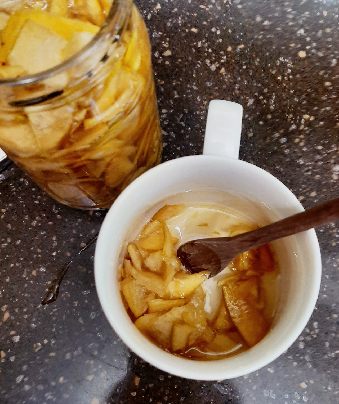 남편에게는 유자차를 타 주었다. 남해에서 잘 키운 유자로 담근 청이라고 라벨에 적혀있었다. 겨울에 유자차는 우리 집 필수템 같다. 우리가 즐겨 마시는 대중적인 유자차 브랜드가 있는데, 다른 곳은 너무 달고 뭔가 인위적인 맛이 나는데 이 것만큼은 언제나 믿고 마시는 듯하다. 내가 따로 주문하지 않아도 겨울이 되면 남편이 유자차를 큰 병을 사 오곤 해서 자연스럽게 마시게 된다. 남편에게는 어떤 차를 타 줄까 물어봐도 늘 유자차라고 말한다.
