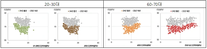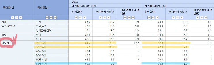 투표는 우리가 민주주의 사회 구성원으로서 목소리를 낼 수단이지만, 젊은 세대일수록 그 의미와 중요성에 대한 인식은 아직 저조하기만 하다. (1) 21대 국회의원 선거와 20대 대통령 선거에 참여 여부를 연령별로 살펴본 결과, 저연령일수록 참여율이 저조했으며, 고연령일수록 높은 참여율을 보였다. (2) 최종투표율이 67.0%라는 높은 참여를 보여줬던 올해 4/11 총선의 경우 또한 마찬가지었다.