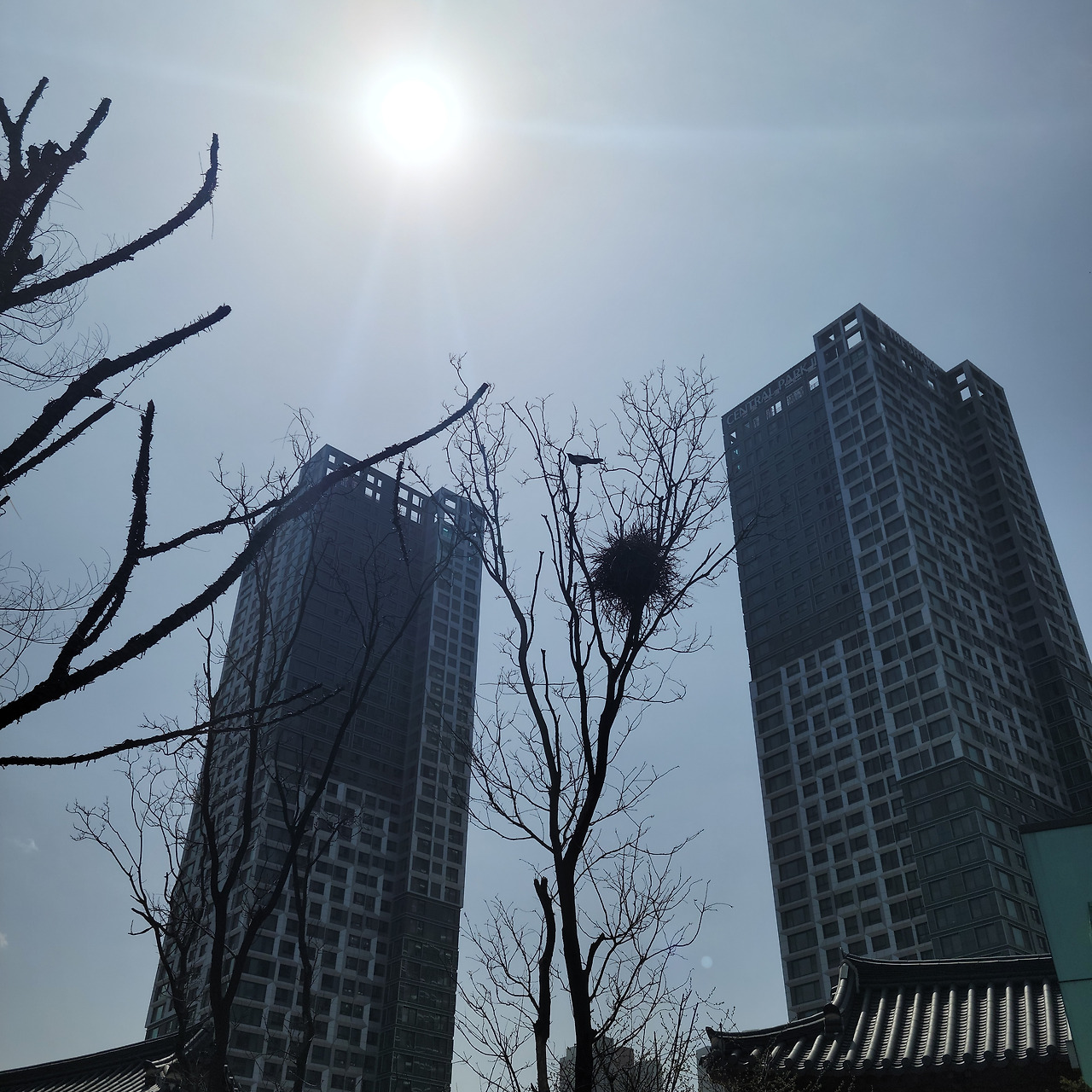 비록 현대문물인 도심 속 빌딩 앞이지만, 땅과 멀어진 나무 위에서 햇빛과 바람을 맞으며 고고히 앉아, 땅 위에서 어렵사리 살아가고 있는 나 같은 인간들의 안녕을 빌어주는 그러한 솟대 위의 나무새가 된다.