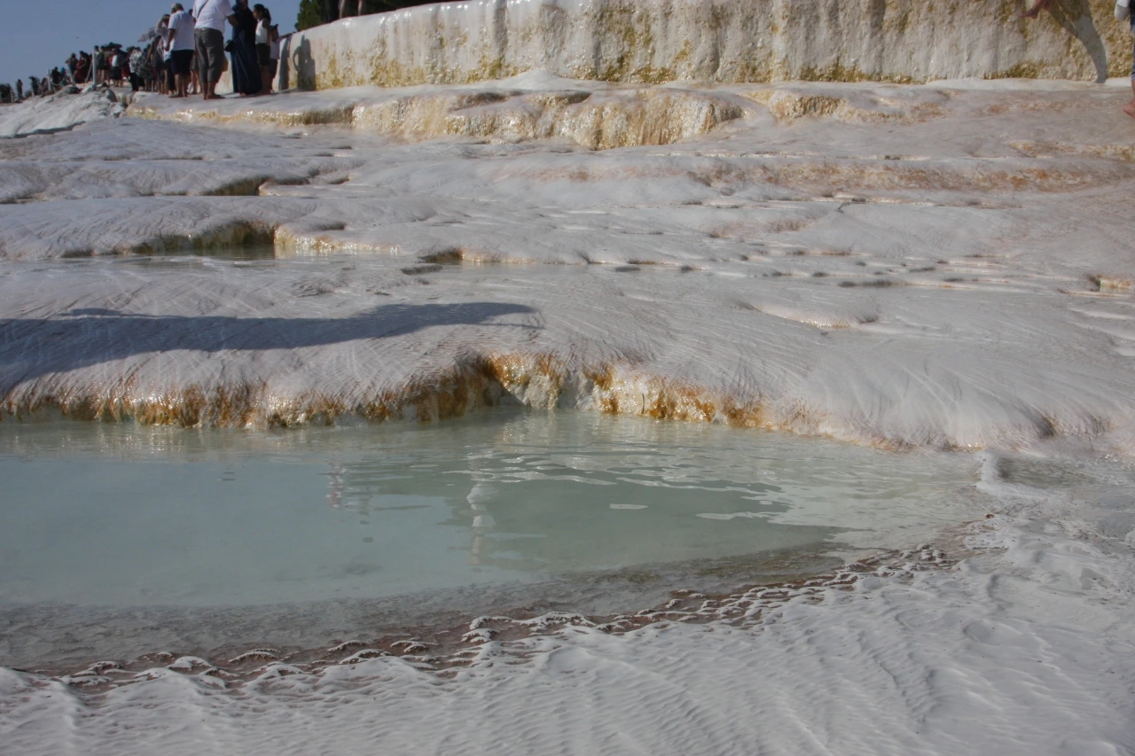 파묵칼레는 신비한 온천이다. 흰색으로 뒤덮힌 모양이 꼭 눈처럼 보이지만 석회층으로 이루어진 독특한 지형이다. 석회 지형에 잔잔하게 고여있는 물이 계단식 모양으로 층층이 이어져 있고 한쪽 면은 흰 절벽으로 되어 있어 마치 거대한 빙하로 둘러쌓인 것 같았다.