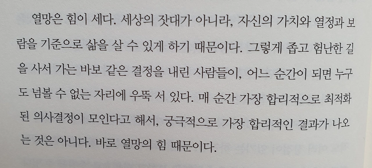 둘 다 맞는 말이다. 그럴 때 이 책에서 나온 "열망은 힘이 세다" 는 말을 새기라고 말해주고 싶다. 세상의 기준과 남들의 잣대가 아닌 자신이 원하는 가치와 열망을 찾으라는 것이다.