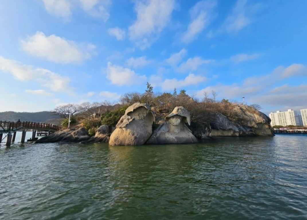 서해와 영산강이 만나는 강하구에 있고 오랜 풍화로 만들어진 바위로 2009년 천연기념물로 지정된 곳이다. 저녁에 가면 석양에 물든 바다와 절벽에 반사된 노을빛이 무척 아름답고 물이 빠지면 더 큰 바위 모습을 선사한다고 한다. 데크 바로 옆으로 출렁대는 바다가 있고 갓바위 뒤로 작은 산이 있었다. 계단을 올라 가니 크고 작은 나무들이 작은 숲을 이루고 있었다. 바위에 앉아 멀리까지 보이는 시원스레 펼쳐진 바다 전망을 보며 아침 산책에 흡족했다.