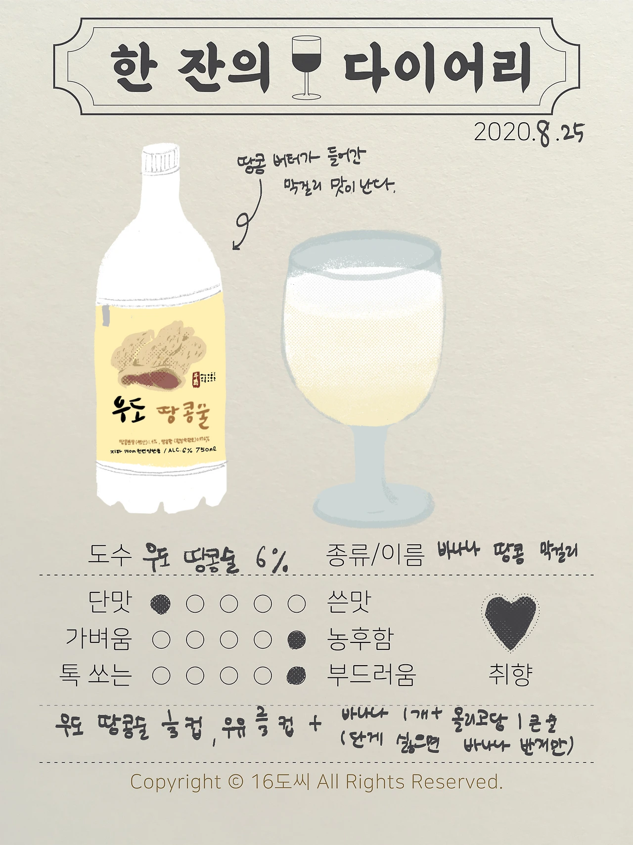 그래서 이런저런 막걸리로 시도해보려고 마트에 갔다가 우도 땅콩 막걸리가 눈에 들어왔다. 공주 알밤 막걸리나 가평 잣 막걸리처럼 은근히 선호하는 사람들이 있어 이름은 들어봤지만 마셔본 적은 없었다. 마침 마트에 있길래 집어왔다.