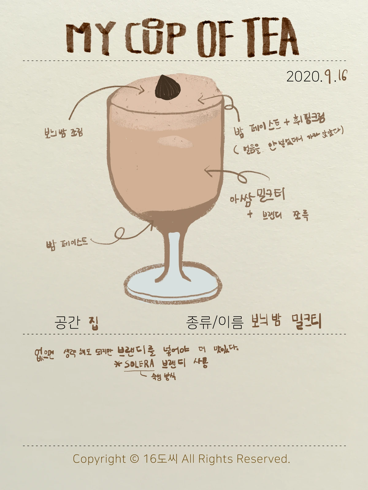 고소하면서도 달달한 바밤바 맛도 나는 듯했다. 그래도 아직 뭔가 심심한 듯 해 밤 조림할 때 넣었던 브랜디를 조금 부었더니 밀크티의 맛이 완성되었다. 향도 맛도 완벽한 숙성된 으른의 맛. 별이 다섯 개!(?) 잊히고 있던 브랜디의 재 탄생이다.