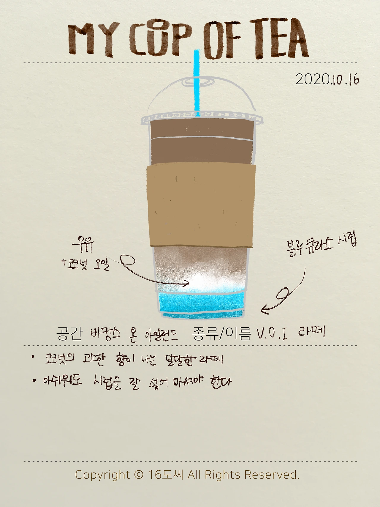 커피는 모래사장, 청량한 파란색 시럽과 우유 층이 한 눈에도 바다를 떠올리게 했다. 마실 때엔 모양이 망가지는 게 아쉬워도 우유와 시럽을 잘 섞어서 마셔야 한다. 바다가 사라져도 코코넛 냄새가 나는 달달한 라테는 카페의 이름과 잘 어울리는 맛이다.