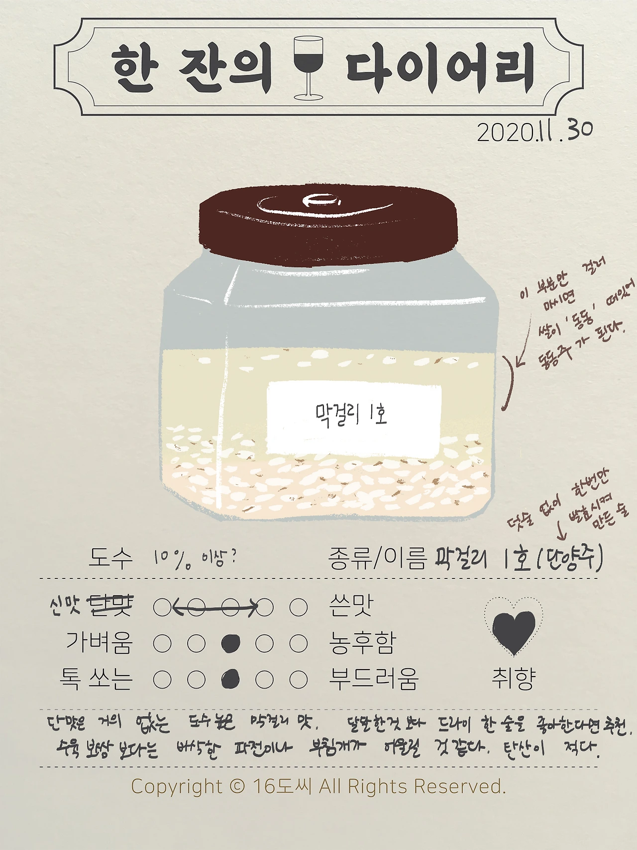 막걸리 개봉을 앞두고 다시 냄새를 맡아봤는데, 냄새가 코를 찌른다는 말은 은유가 아니었을지도 모른다는 생각이 들었다. 삭힌 홍어를 처음 먹어봤을 때도 코가 뻥 뚫리긴 해도 괜찮았는데, 알코올 때문인지 갑자기 훅 들어오는 막걸리 냄새가 나의 콧 속을 푹 찔렀다. 마치 이쑤시개로 찔린 것처럼 아팠다. 화학 약품 냄새를 맡을 때처럼 손 바람으로 냄새를 맡았어야 했나 보다. 음 강해졌구나 막걸리 1호. 이제 개시해도 된다는 뜻이겠지?