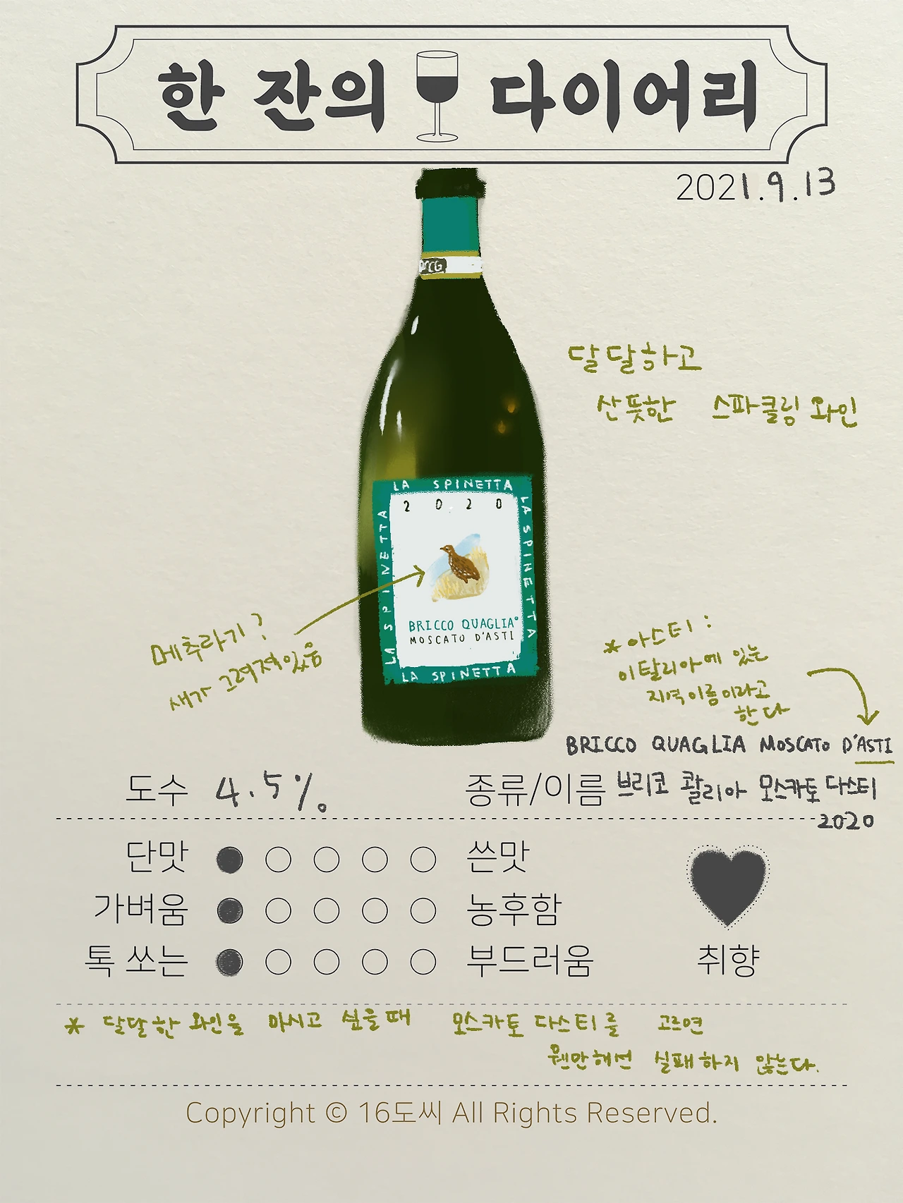 이번에 마신 라 스피네타 브리코 콸리아 모스카토 다스티는 모스카토 다스티 중에서도 유명한 와인이었다.