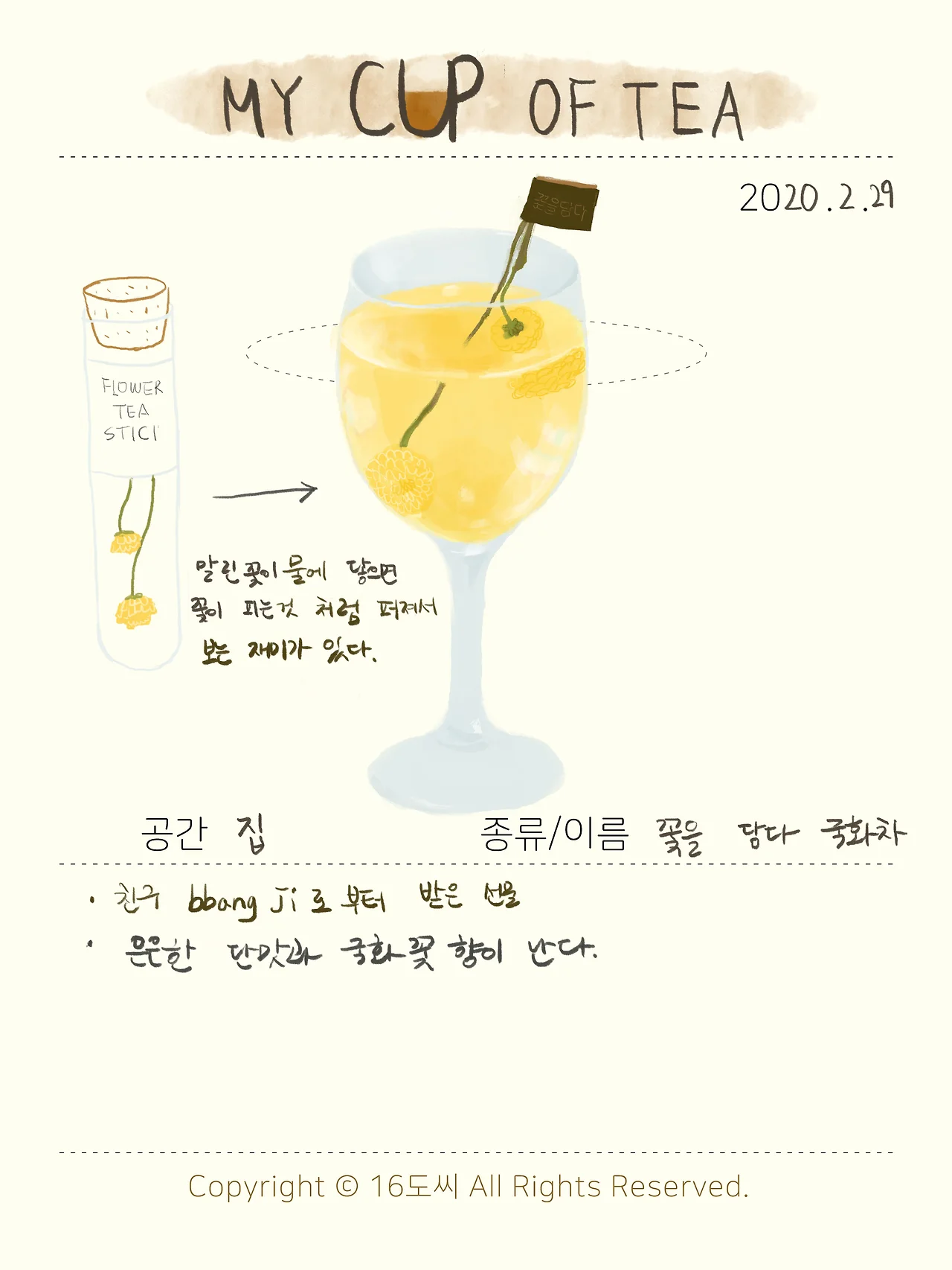 스틱에 뜨거운 물을 부으니 마치 말린 꽃이 되살아나는 느낌이었다. 작은 두, 세 송이의 꽃으로도 충분히 은은한 향과 맛이 났다. 와인 잔에 마시니까 더 색다른 느낌. 응용해서 국화차 대신 티 스틱을 이용한 칵테일이나 음료를 만들어도 보기 좋을 것 같다는 생각이 들었다. 아까워서 시도는 못하겠지만.
