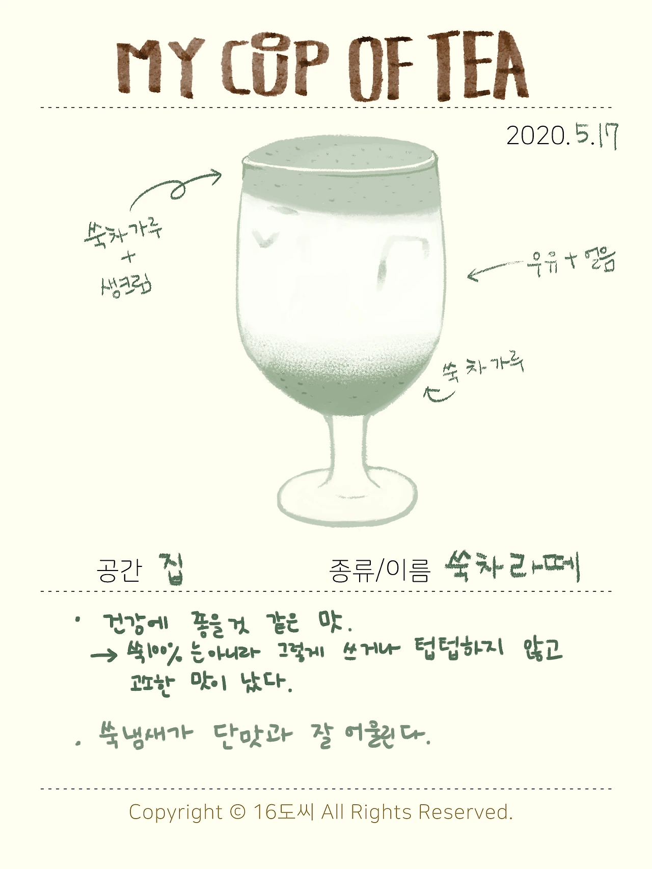 쑥차 가루를 물에 진하게 개어 우유에 타면 끝이다. 여기에 쑥 아이스크림이 있었으면 참 좋았을 텐데 조금 아쉬웠다. 대신 쑥차 라테 위에 쑥차 가루를 넣어 색깔을 낸 생크림을 올려 카페에서 마시는 기분을 냈다. 쑥 냄새는 역시 단맛과 잘 어울린다. 마트에서 산 쑥차 가루는 100% 쑥이 아니라 쑥의 씁쓸한 맛이 강하진 않았고 곡물의 고소한 맛이 났다. 인스턴트이긴 해도 봄의 기운을 채웠으니 이제 슬슬 봄을 보내고 여름을 맞이 할 준비를 해야겠다.