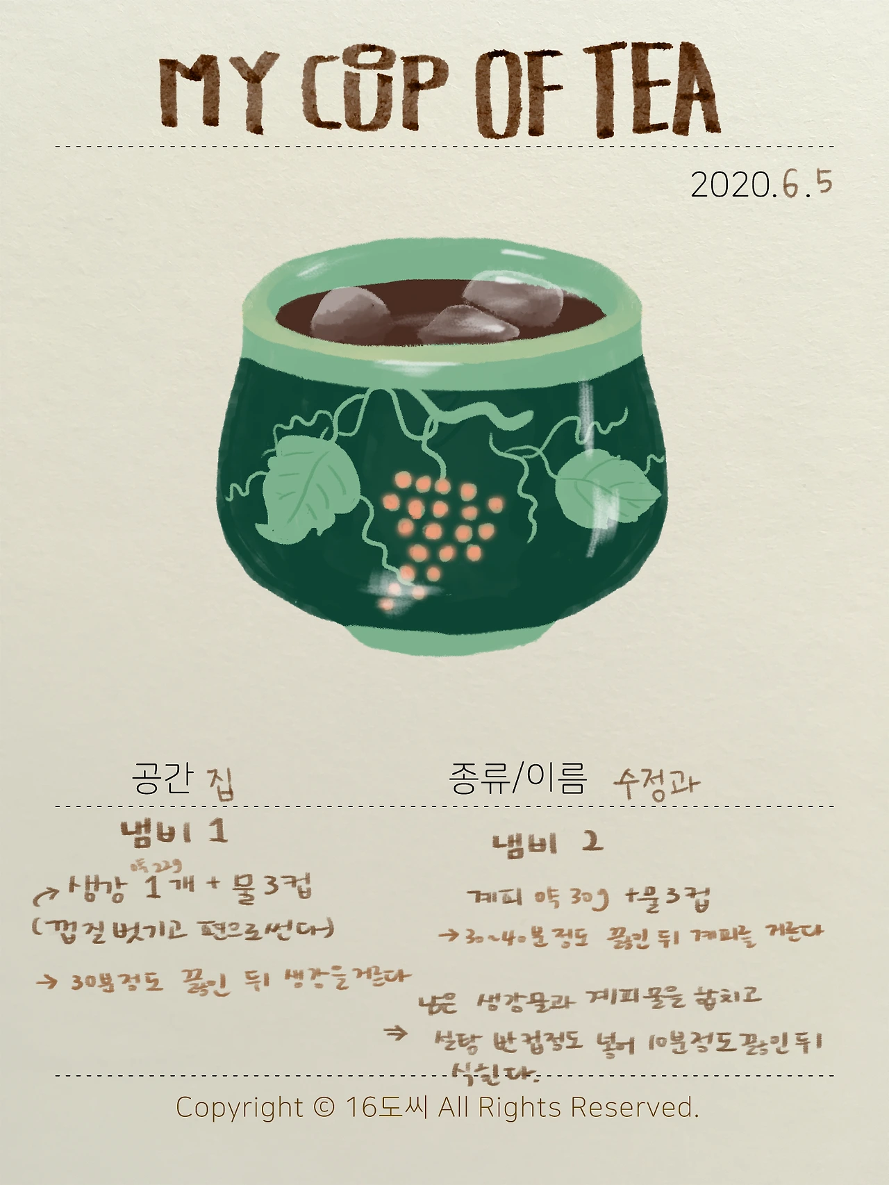 냉장고에 고기 양념으로 쓰고 남은 생강이 말라비틀어져가길래 뭐라도 해 먹어야겠다 고민하던 중 수정과가 떠올랐다. 아마도 날이 갑자기 더워진 탓인 듯하다.