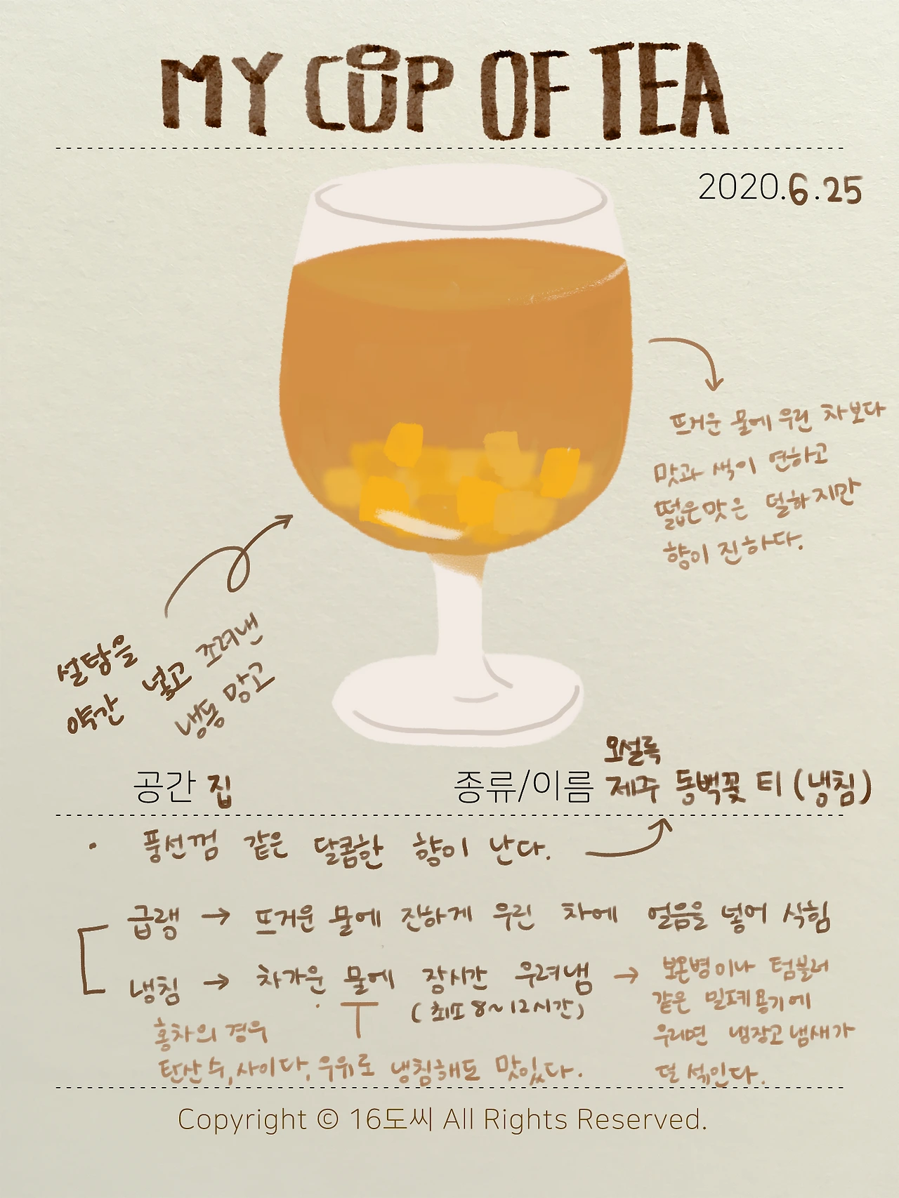 여러 번 냉침 차를 시도했지만 과일은 시트러스 계열이 아니라면 어설픈 새콤한 맛만 나서 차를 망치는 느낌이 들었다.