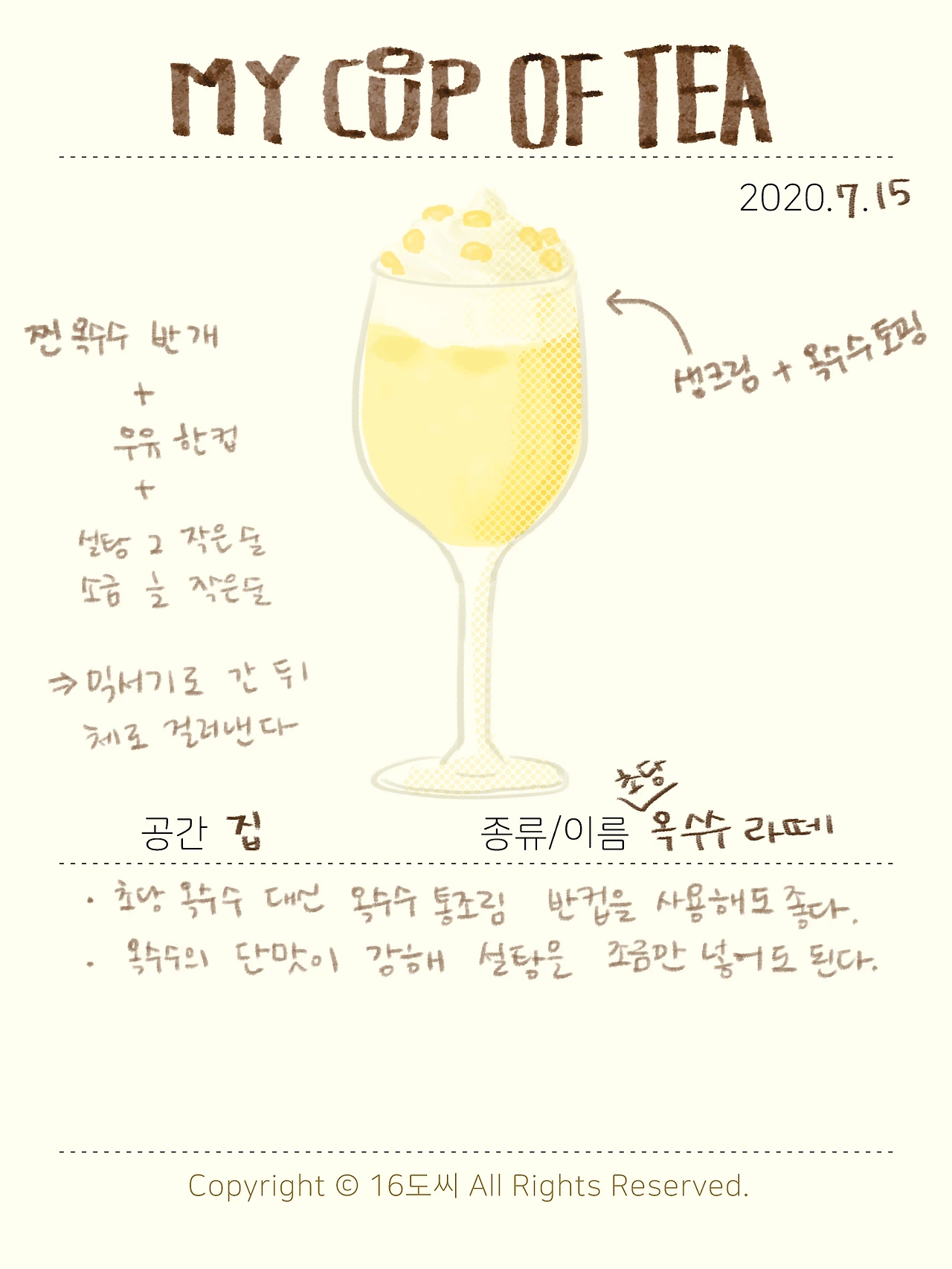 남은 하나로는 옥수수 라테를 해 먹기로 했다. 옥수수를 반으로 잘라 옥수수 알만 분리해서 우유, 설탕, 소금을 넣고 갈아준 다음 체로 걸러내면 된다. 옥수수의 단맛이 강해서 설탕은 2 티스푼만 넣어도 달다. 거기에 취향에 맞게 소금으로 간을 하면 된다. 달고 짭짤한 맛이 내 입맛에 맞았다. 바닐라 아이스크림만 있었으면 더 좋았을 것 같다.