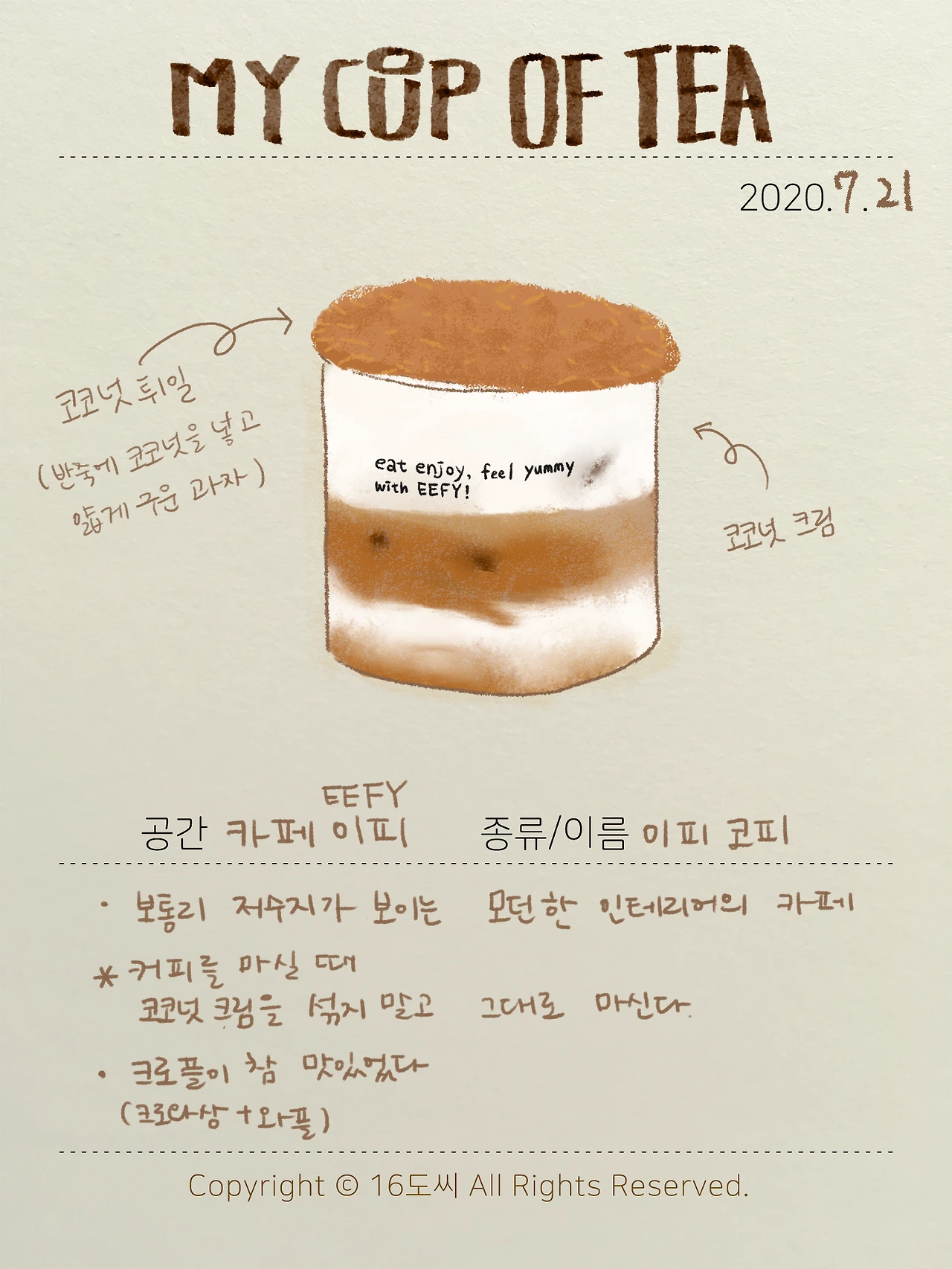 우리의 목적은 하나, 크로플이었다. 사실 sns 상에서 유명한 것은 알고 있었지만 딱히 큰 기대 하지는 않았었다. 그냥 크로와상 생지를 와플 팬에 구운 거 아닌가? 했는데, 그렇기 때문에 맛있는 것이었다. 따끈하고 고소한 빵과 차갑고 달달한 바닐라 아이스크림의 조화. 한 조각 먹어보고 괜히 인기가 있는 게 아니었다는 걸 알게 되었다. 그리고 카페에 가면 꼭 마셔봐야 할 시그니쳐 커피. 이피 코피는 코코넛 크림이 올라간 커피로 코코넛 튀일과 함께 나온다. 이 커피를 마실 때는 코코넛 크림을 섞지 않은 상태에서 그대로 마셔야 한다고 한다. 역시 코코넛이 들어간 커피는 웬만해선 실패하지 않는다. 이대로 커피만 마시고 끝나는 건 아쉽다.