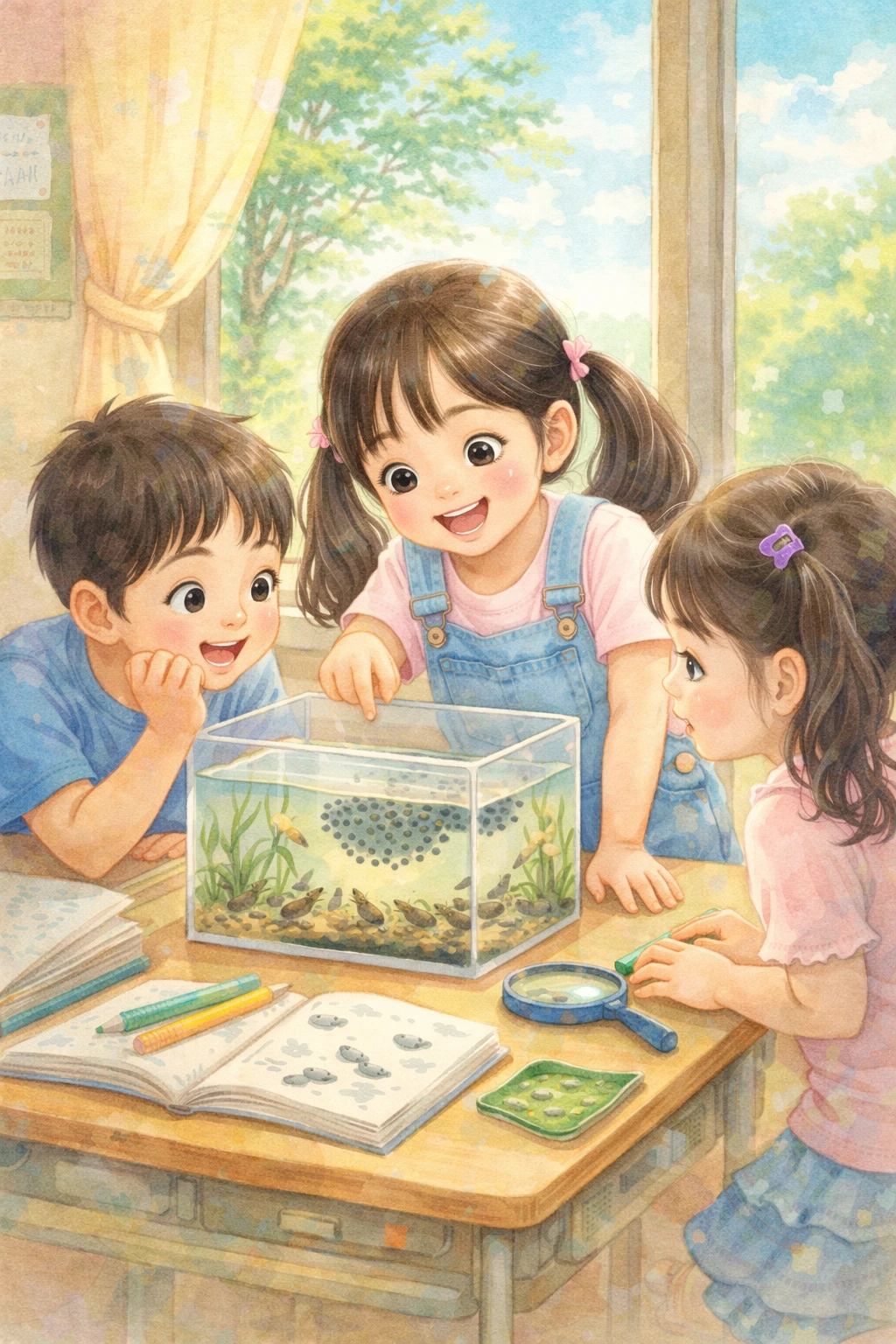 이윽고 시간이 좀 흐르자 개구리알에서 올챙이가 터져 나왔다. 까맣고 볼록한 머리 뒤로 구불구불한 꼬리가 빠르게 움직였다. 달걀노른자를 먹이면 건강하게 잘 자란다는 선생님의 말씀을 듣고, 나는 어머니께 부탁해서 다음날 노른자를 가져왔다. 우리는 "뒷다리가 쏘옥, 앞다리가 쏘옥, 팔딱팔딱 개구리 됐네."라는 동요를 직접 보고 듣고 느꼈다. 그렇게 우리는 올챙이 마냥 쑥쑥 자라고 있었다.