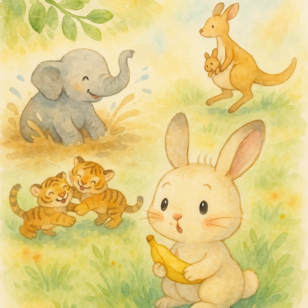 아기 토끼는 호기심이 많아요. 세상의 모든 것이 신기하고 재미있지요. 코끼리 삼촌이 흙탕물에서 시원하게 목욕을 하는 모습, 캥거루 아줌마가 주머니에 아기 캥거루를 쏘옥 넣고 껑충 뛰는 모습, 아기 호랑이들이 서로 으르렁 거리며 물고 구르며 장난치는 모습..... 아기 토끼는 동그란 눈을 크게 뜨고, 두 귀는 쫑긋 세우고 그런 모습들을 즐겁게 바라보아요. 무엇보다 아기 토끼는 과일이랑 채소를 좋아해요. 그중에서도 노랗고 달콤한 바나나를 정말 좋아해요.