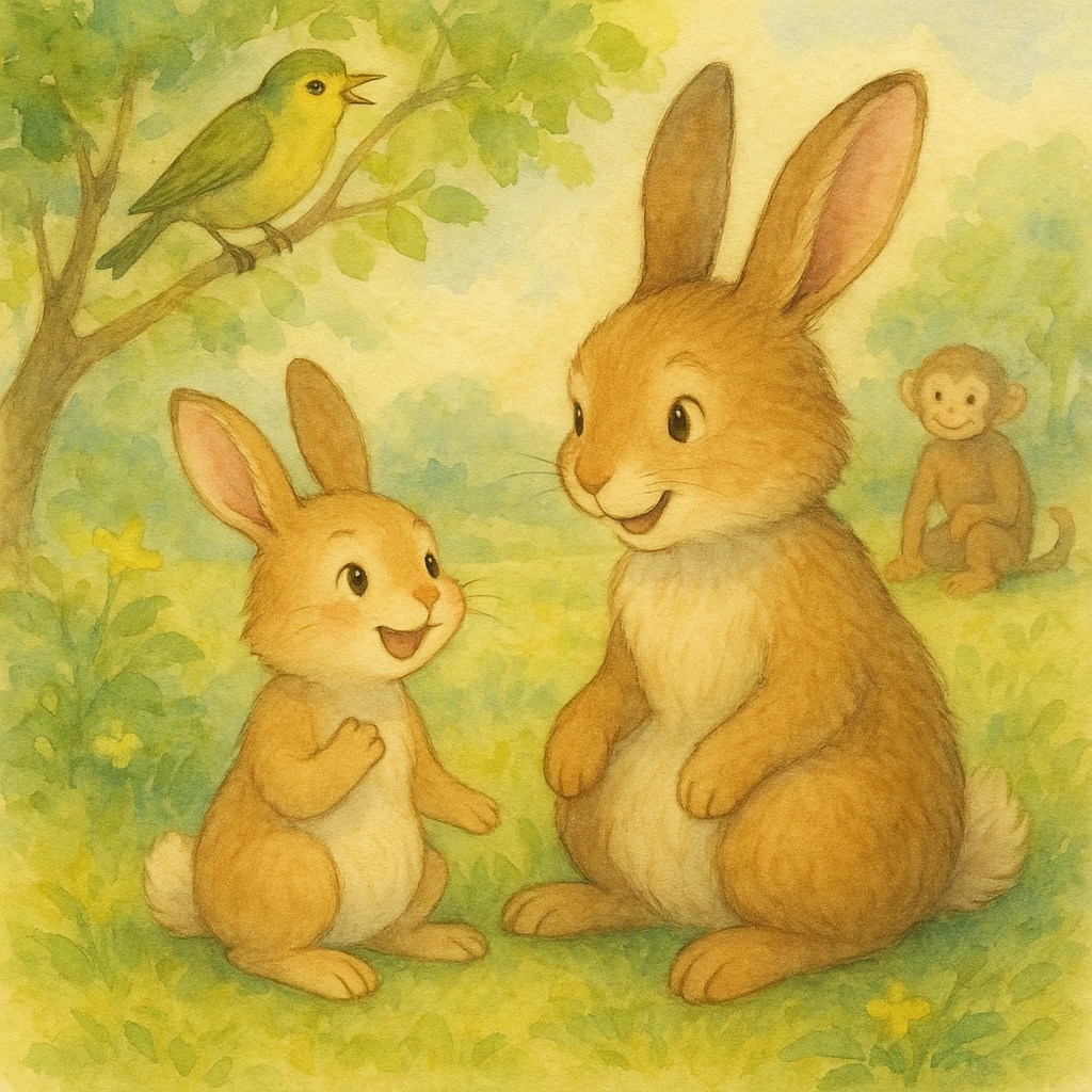 아기 토끼는 풀이 죽어서 집에 돌아왔어요. 엄마 토끼가 걱정스러운 얼굴로 물었어요. "아가야, 무슨 일 있었니?" 아기 토끼는 주저하다가 아까 원숭이 친구가 했던 이야기를 털어놓았어요. 그러자 엄마 토끼는 다정한 얼굴로 아기 토끼를 토닥이며 말했어요. "아가야, 바나나를 좋아한다고 토끼가 원숭이가 되는 건 아니란다. 너는 여전히 귀여운 아기 토끼란다." "정말요? 대부분 원숭이들이 바나나를 좋아하던데요." "바나나는 바나나일 뿐이야. 우리 아가는 바나나 말고 또 좋아하는 건 없니?"