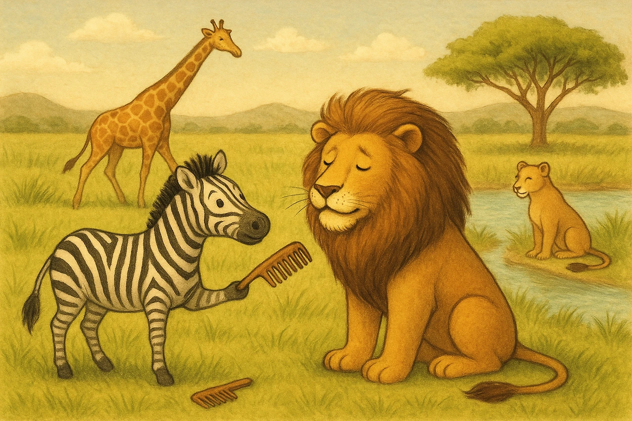 사자는 배가 너무 고파서 꼬르륵 소리가 났지만, 난생처음 보는 빗을 보고는 마음이 흔들렸다. 잠시 고민하다가 사자는 그 빗을 받고 얼룩말을 살려주었다.