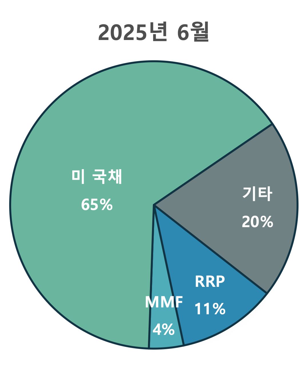 현재 스테이블코인의 구조는 이런 내로우 뱅크와 매우 유사합니다. 위의 파이차트는 2025년 6월을 기준으로 대표적인 달러 스테이블코인인 테더 (USDT)의 발행사가 보유하고 있는 준비자산의 구성을 보여줍니다. 전체의 약 65%가 미국 국채로 구성돼 있고, 여기에 연준의 역레포(RRP)와 머니마켓펀드(MMF)처럼 사실상 현금과 다름없는 자산이 더해집니다. 이 자산들은 수익을 극대화하기 위한 포트폴리오가 아니라, 언제든 1달러를 요구받으면 바로 1달러를 내줄 수 있도록 설계된 구조입니다.