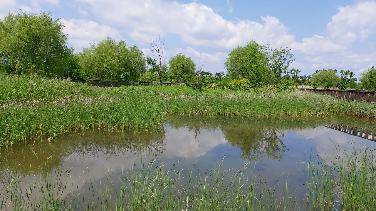 늪에 우거진 갈대 무리 아래 수로에서 이름 모를 물고기가 첨벙거리며 소리를 낸다. 늪의 한가운데 외로이 서 있는 나뭇가지에 앉은 뻐꾸기는 '뻑꾹, 뻐뻑꾹'하며 짝을 부르고 있다. 보이지 않는 건너편 풀숲에서는 '꿩꿩'거리는 수꿩의 외침이 간헐적으로 들려오고, 멀리서는 까치들의 합창이 메아리친다. 아! 평화스럽다는 말을 지금 아니면 언제 할 수 있을까 싶다. 가까운 수로에서 풀밭으로 나온 오리들의 뒤뚱거리는 산책 모습은 이곳이 새들의 보금자리임을 일깨운다.