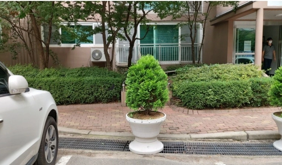 이 아파트에는 장애인을 위한 배려는 진정 없는 것인가? 장애인 말고도 많은 택배인들이 이 통로를 이용할 텐데~~ 옆 라인의 입구를 보니 휠체어 이동통로 앞에 역시나 큰 화분이 똑같이 놓여 있다. 완전 쇼크였다. 이런 구상을 한 사람과 이를 대수롭지 않게 여기는 이곳 주민들은 어떤 사람들일까? 도저히 납득이 되지 않는 이상한 나라의 아파트에 들어온 것임에 틀림이 없다.