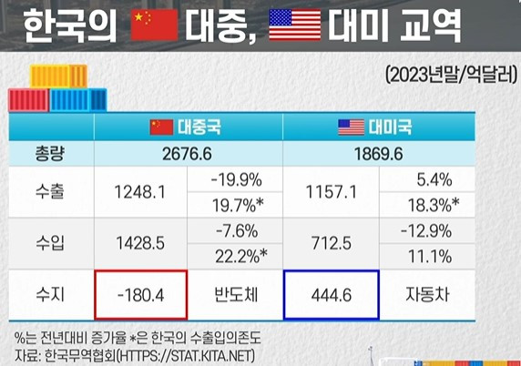 - 산업연구원 ‘2024년 경제·산업전망보고: 중국의 제조업의 경쟁력이 향상되어 중간재 자급률도 높아졌고, 이것이 한국산 중간재 수출에도 부정적 영향을 주고 있다. - 한국의 이차전지산업이 발전하면서 리튬, 전구체는 전적으로 중국에 의존 - 2023년 미국과의 교역에서 445억 달러 무역흑자 기록 ┖ 대미수출 호황은 전체 수출액의 30% 정도를 차지하는 자동차, 이차전지 소재 수출이 주도 ┖ 안보는 미국, 경제는 중국이라는 ‘안미경중(安美經中)’에서 안보도 미국, 경제도 미국이라는 ‘안미경미(安美經美)’로 가야 하는 것이 아닌가라는 논의가 있음