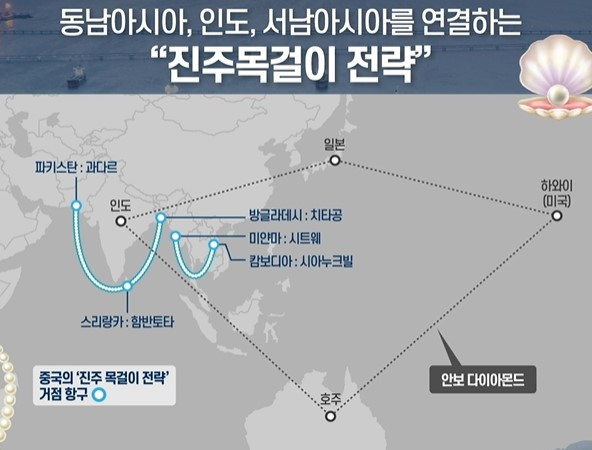 - 마오루 기옌 ‘2030 축의 전환’: 2040년대 중반에 이미 아시아 중산층의 구매력이 전 세계 중산층 구매력의 60%를 넘게 됨. → 아시아의 부상이 얼마나 빠르고 압도적인지를 잘 말해주고 있음 - 중국은 아시아에서 교두보를 만들어 글로벌 영향력을 확대하고자 함 → 동남아시아, 인도, 서남아시아를 연결하는 ‘진주목걸이 전략’, 이에 대해 미국은 이렇게 가면 미국 패권의 쇠퇴가 더욱 가속화된다고 보고 인도, 일본, 호주 등 자유주의 국가를 잇는 ‘안보 다이아몬드’ 전략을 통해 중국을 에워싸고자 추진 중