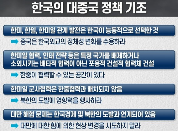 ▣ 한중 정치 쟁점 – 인식, 기대, 역할의 차이 - 정치적 한중관계 ┖ 인식차이, 기대차이, 역할차이가 존재 - 한국의 대중국 정책 기조 - 시진핑의 중국 ┖ 한국의 정책변화(대 중국 기조)에 대해서 비판적 입장 ┖ 한미동맹에 대해서 동의는 하지만, 한미동맹의 지역화에 대해서는 자국의 내정에 난폭하게 개입하고 있다고 강력하게 반발 ┖ 특히 미중 경쟁전략이 심화되면서 한중관계에서도 부정적 영향을 미침 ┖ 한국의 정치적, 외교적 요구를 수용할 생각이 점차 약해지고 있음 ┖ 중국은 상대적으로 북한에 대해서 비교적 유연한 정책을 펴고 있고, 북핵 문제와 UN안보리 제재에도 소극적으로 변하고 있음 ·힘 빠진 UN안보리 대북제재, 기권한 중국의 속내는? ·UN 안보리서 또 북한 감싼 중·러, “서방이 과도한 반응” ·UN 안보리서 북 감싸는 중·러, 북한의 성격변화 보여줘 ┖ 한중 간 위상을 어떻게 정립할 것인가에 대한 진실의 순간이 가까이 다가오고 있음