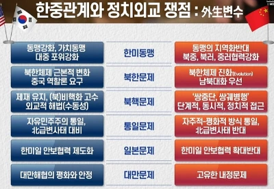 - 그렇다면 한중관계는 어떨까? ┖ 사실 한중간 양자 간의 쟁점은 생각보다 많지 않음 ┖ 한중관계가 어려운 이유는 외생변수(外生變數), 즉 제3의 변수가 한중관계에 작용하기 때문 ┖ 한미동맹, 북한/북핵 문제, 통일문제, 일본문제, 대만문제 등 어느 하나 쉬운 문제가 없음 ┖ 한국과 중국 모두가 발전한 국가이기 때문에 서로를 바라보는 시각이 점차 달라지고 있음 → 한중관계가 점차 구조적인 어려움에 빠져드는 상황