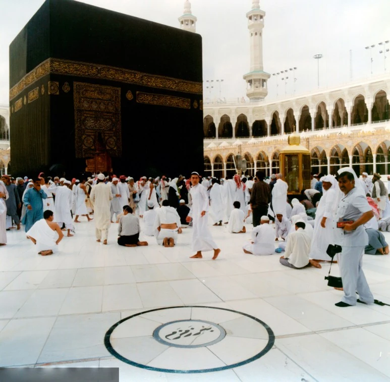 <메카의 알 하람에 위치한 원래의 Zamzam 우물의 위치 - 뒤에 보이는 검은색 사각형의 구조물이 카바 신전>